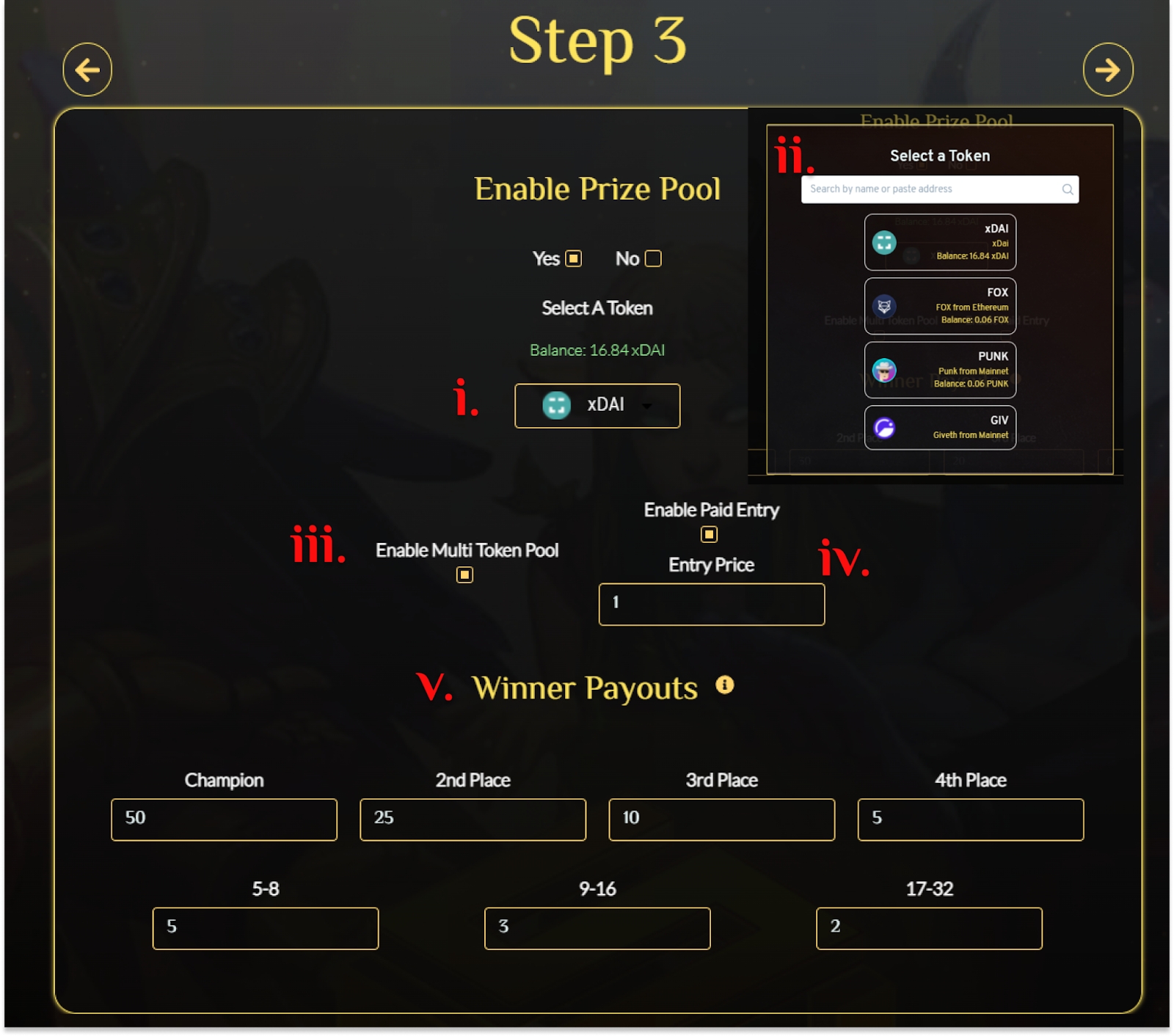 iii. Multi Token Pool- Selecting this option allows for any multiple tokens to be used in the tournament prize pool.